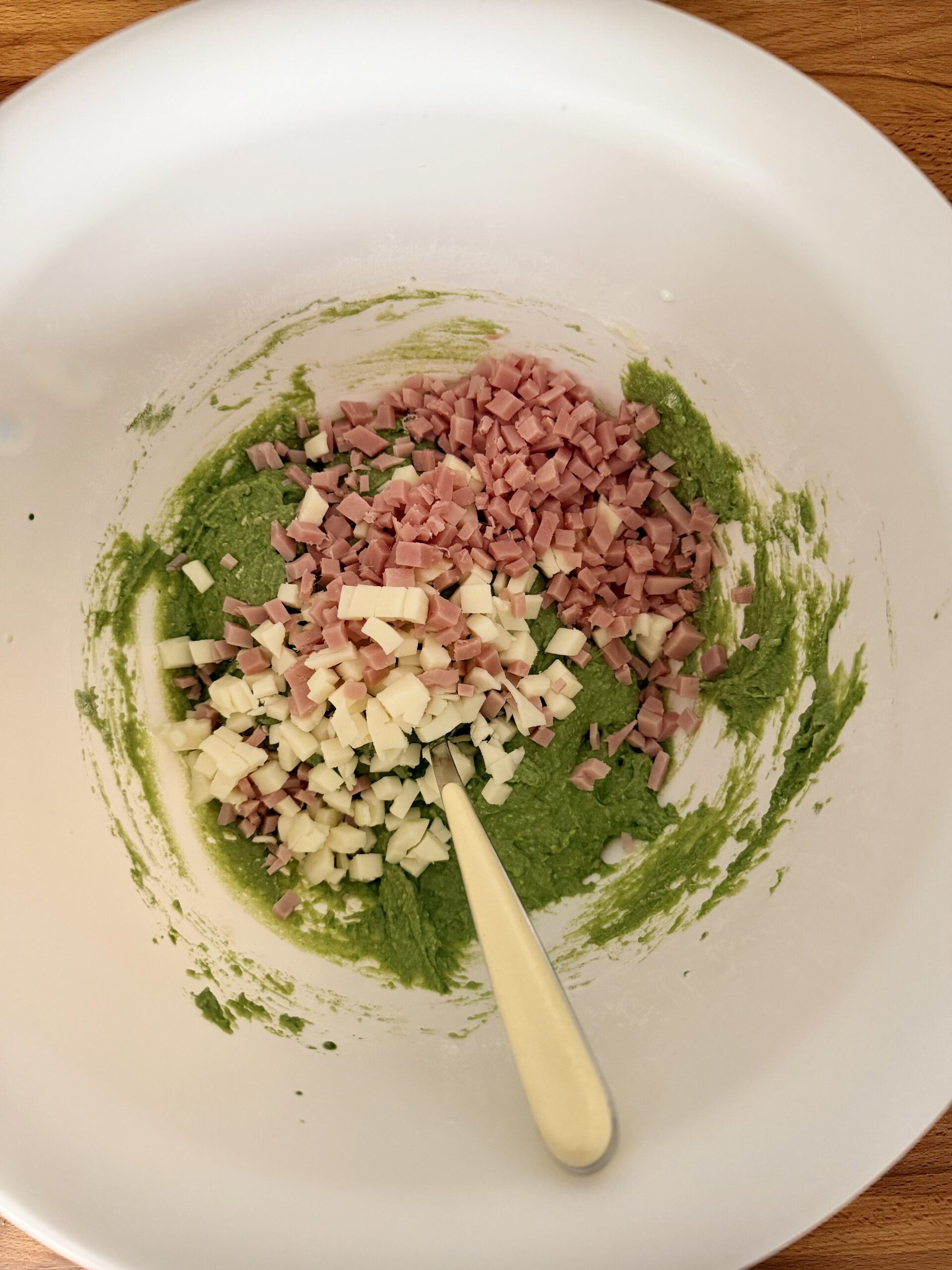 Infine, unite il prosciutto cotto e la scamorza, tagliati a piccoli cubetti (2). Mescolate con un cucchiaio per farli distribuire.