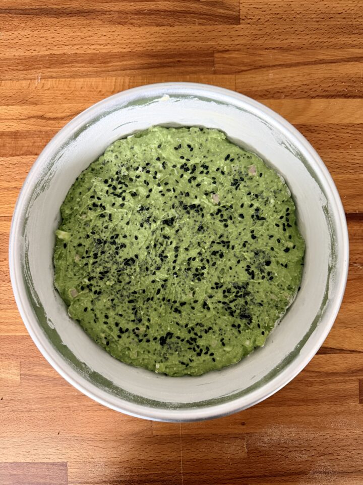 Imburrate e infarinate la tortiera (oppure rivestitela con carta forno), versateci l’impasto e livellatelo. Cospargete a piacere con semi di sesamo o papavero (3).