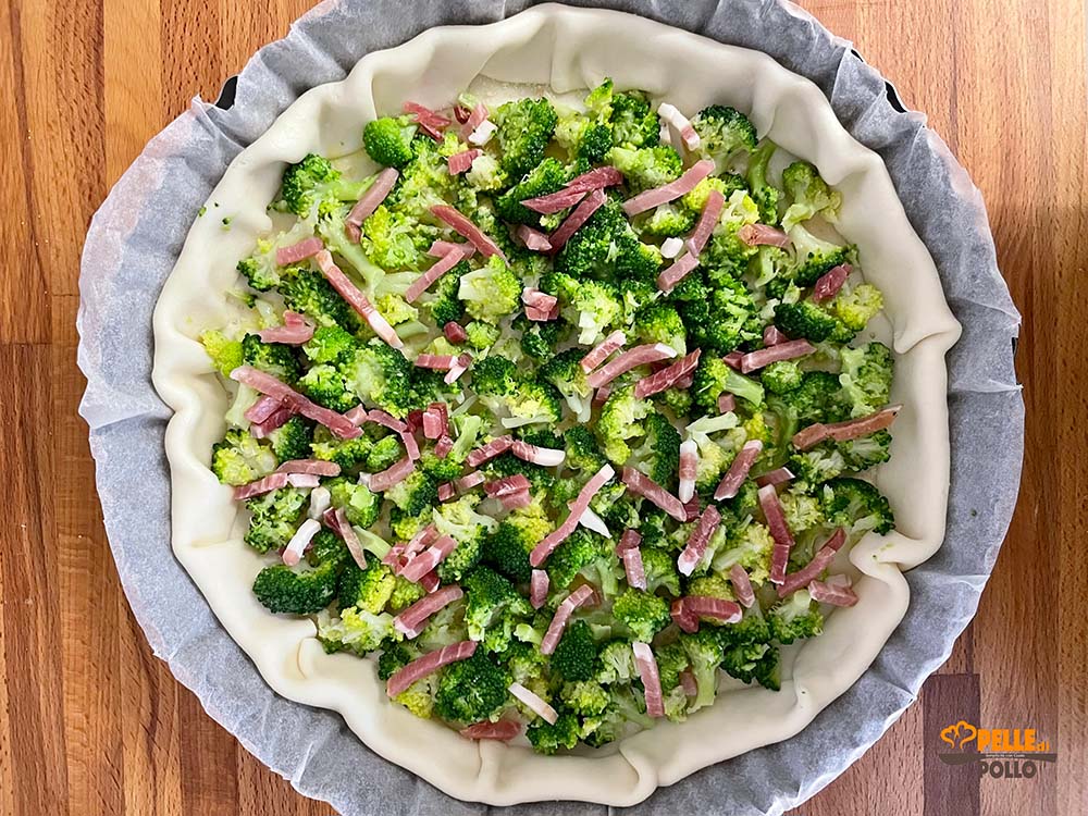 Farcite la pasta sfoglia con le cimette dei broccoli e i cubetti di speck.