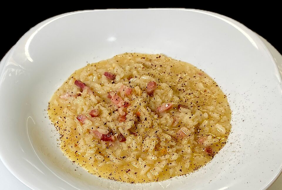 RISOTTO AL FUMO – Ricetta di Piero Benigni – Particolare e intrigante, si fa con pancetta e scamorza affumicate e il loro sentore resta gradevolmente nel piatto finito, donde il nome.