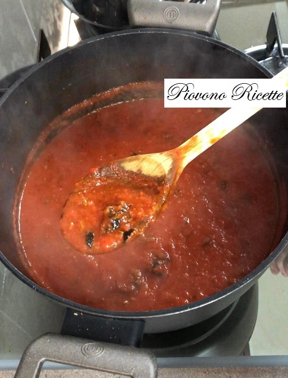 Trascorsi circa 25 minuti insaporiamo il sugo di pomodoro unendo anche: i capperi, le olive ed un’altra abbondante manciata di origano.