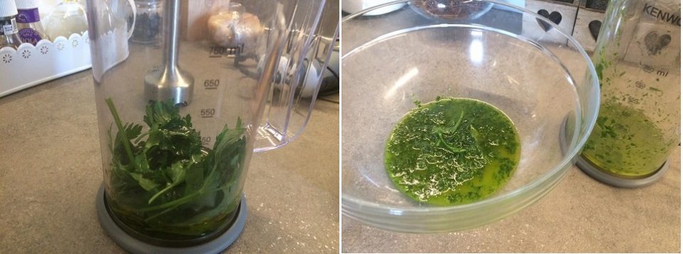 Nota: questa operazione servirà per estrarre tutti gli olii essenziali del prezzemolo e profumare l’olio. In alternativa però potete tranquillamente sminuzzare il prezzemolo con un coltello e mescolarlo accuratamente all’olio.