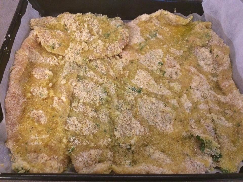 Terminata la panatura di tutte le fette di pollo, irroriamole con un pò d’olio ed insaporiamole con un pizzico di sale.