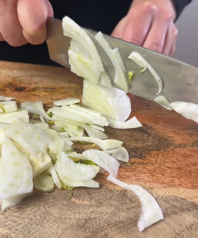 Tagliamolo a spicchi e poi a fette sottilissime.