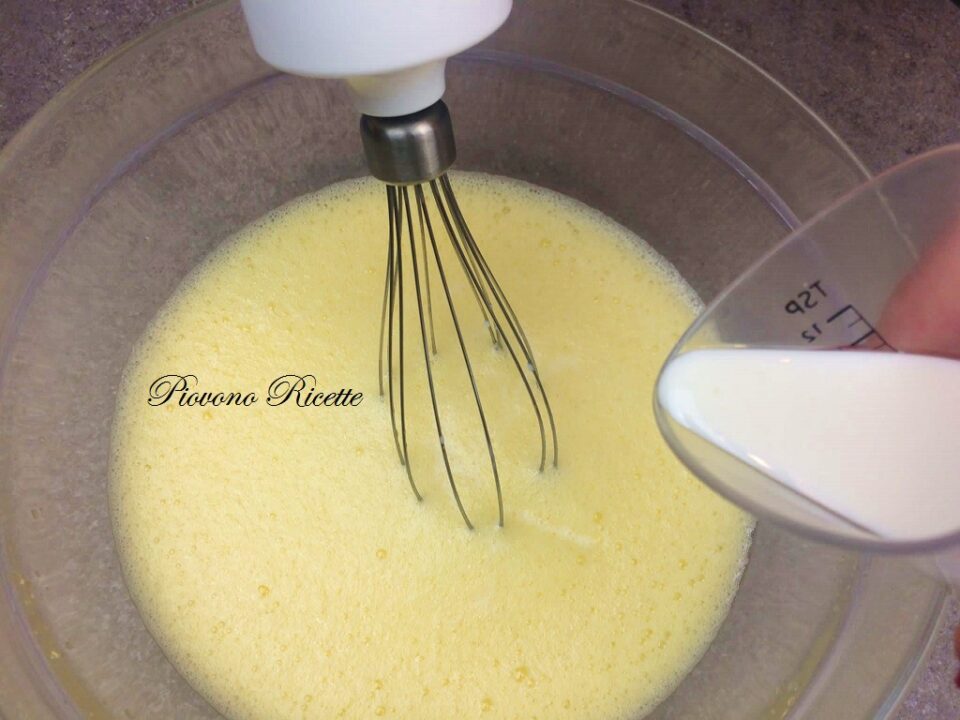 Sempre continuando a lavorare l’impasto con le fruste, aggiungiamo l‘olio di semi a filo e poi il latte, a temperatura ambiente (sempre a filo, un pò alla volta).