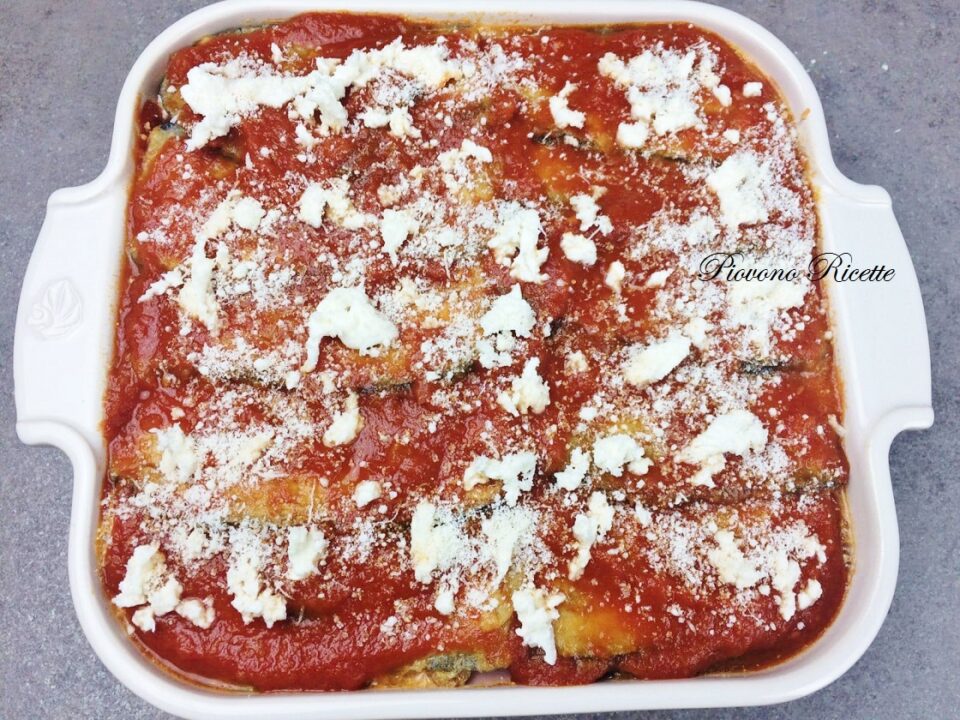 Ricopriamo il tutto con il secondo strato di melanzane, disponendole però in senso contrario allo strato precedente (quindi in senso orizzontale).