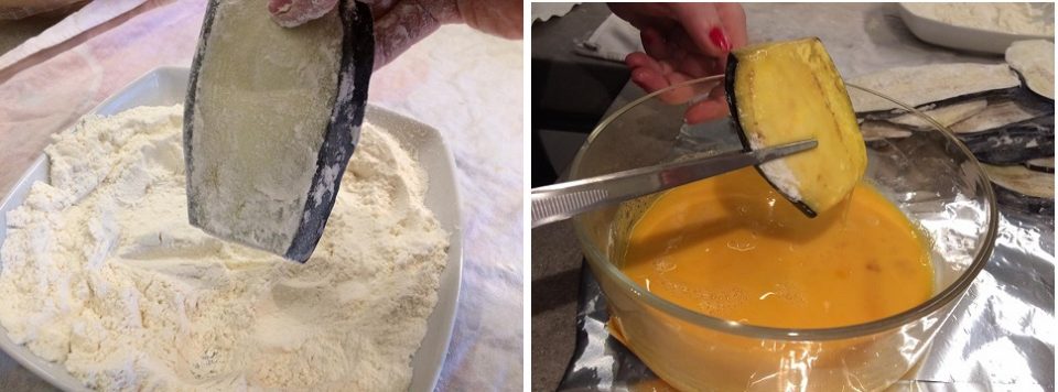 Passiamo le fette di melanzane dapprima nella farina (scotolandole bene da quella in eccesso) e poi nelle uova (potete aiutarvi con una pinza da cucina come ho fatto io!)