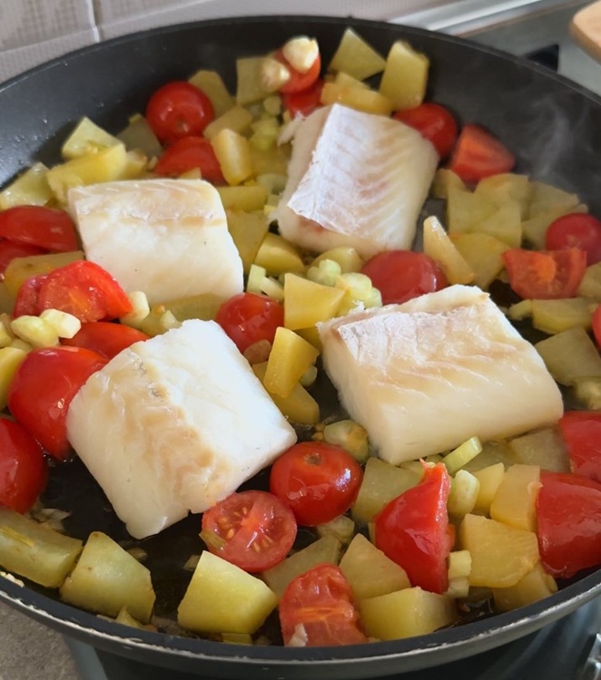 Aggiungiamolo nella padella creando degli spazi tra le verdure, così potrà rosolare da entrambi i lati e prendere tutto il sapore del condimento. Io aggiungo anche un po’ di pepe.