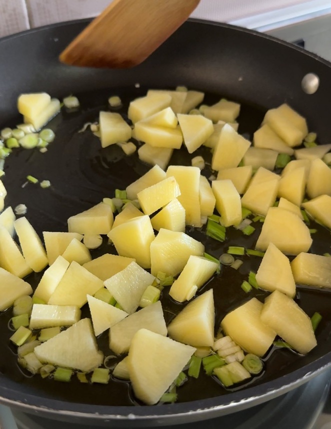 Aggiungiamo le patate tagliate a piccoli tocchetti. Lasciamole andare piano piano aggiungendo, se serve, un goccio d’acqua.