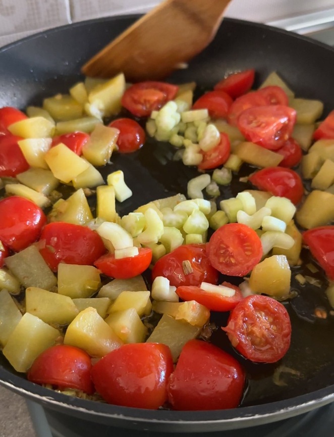 Quando arrivano a metà della loro cottura uniamo i pomodorini tagliati a metà e il sedano (solo il cuore, la parte più tenera) sminuzzato.