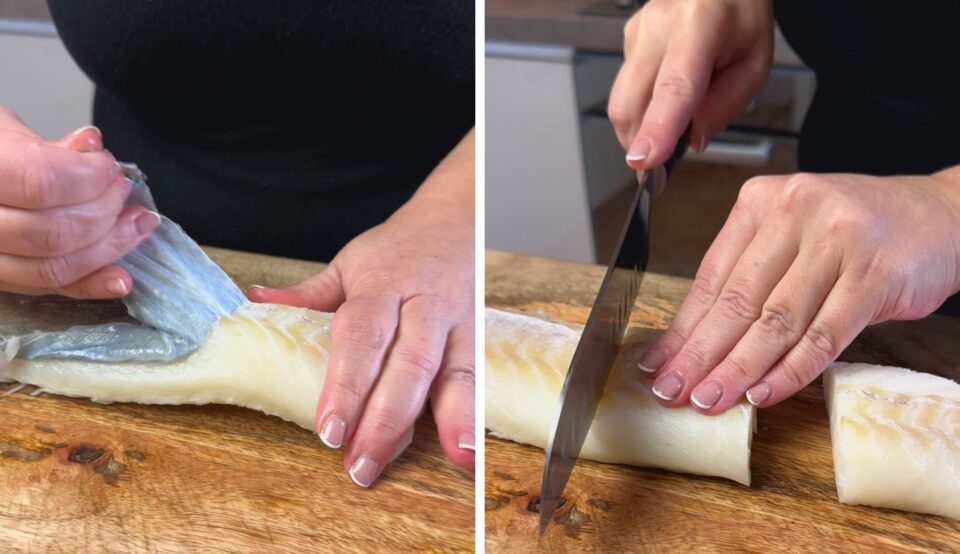 Eliminiamo la pelle dal filetto di baccalà e tagliamolo a tranci.