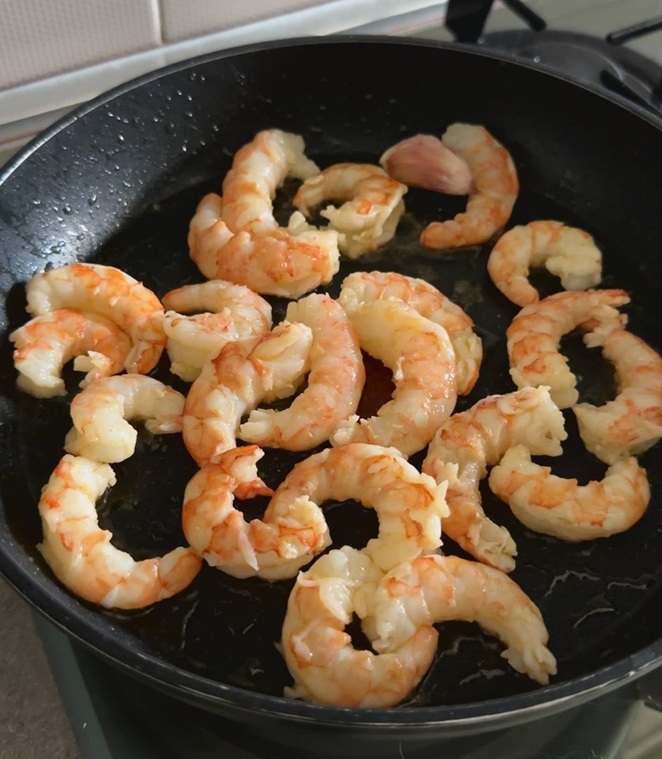Appena sarà ben calda, uniamo i gamberi e cuociamoli per un minuto, girandoli di tanto in tanto.