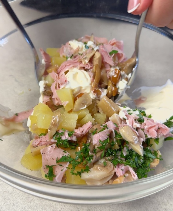 Uniamo i funghi sottolio (ben sgocciolati e asciugati con carta assorbente) sminuzzati, il prosciutto cotto a fette sminuzzato, un pizzico di sale, pepe, un po’ di prezzemolo tritato ed un po’ di maionese.