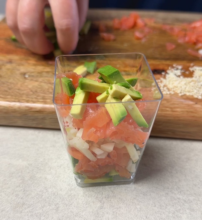 Per i bicchierini salati: formiamo il primo strato di avocado, salmone e finocchio. Proseguiamo allo stesso modo per un altro strato.