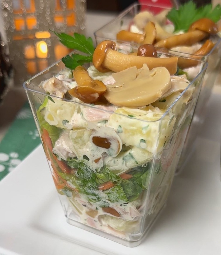 Formiamo i bicchierini: primo strato con patate e funghi, poi insalata, e ricopriamo con patate e funghi.