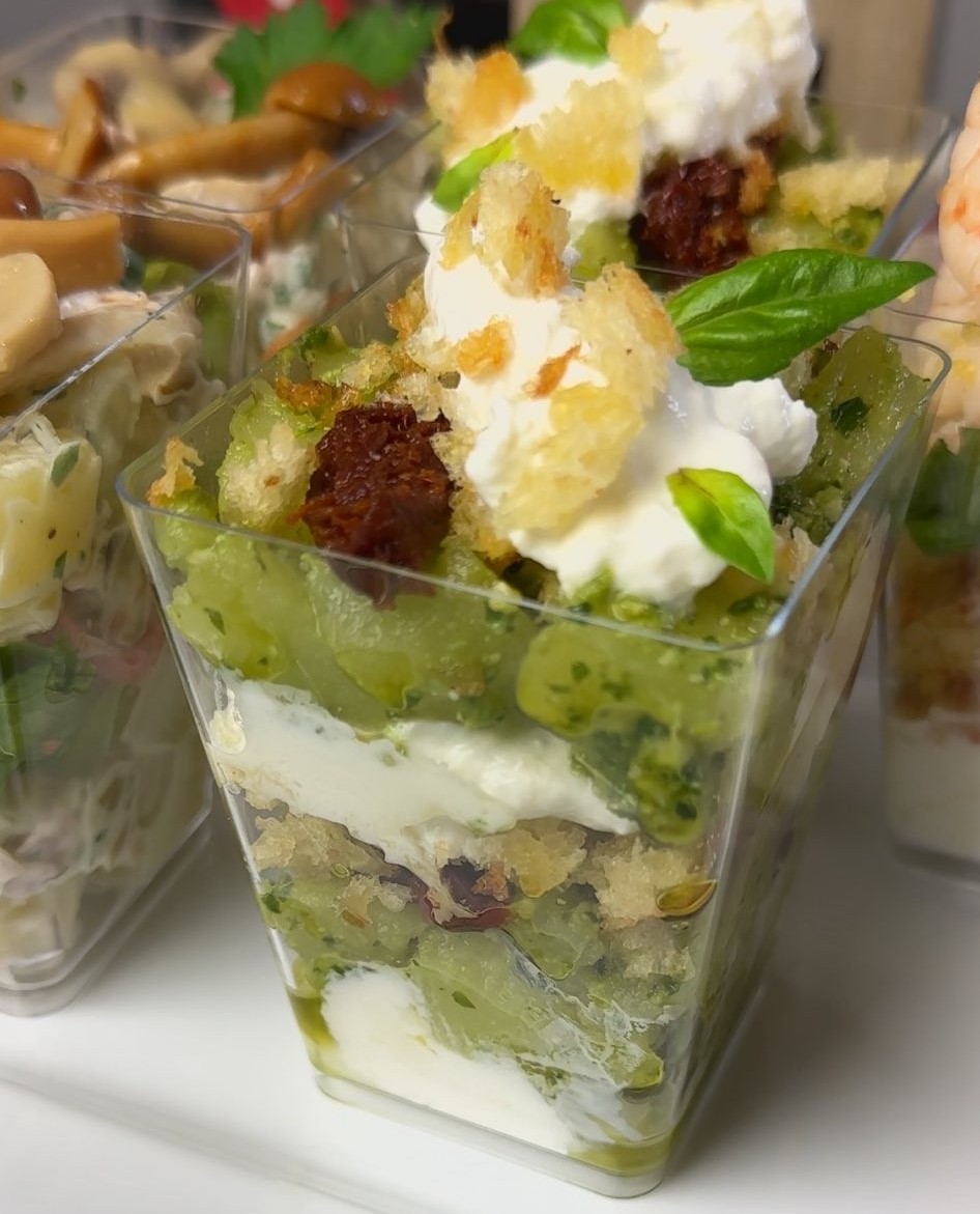 Possiamo comporre i bicchierini salati: basterà semplicemente riempirli alternando a strati stracciatella, patate al pesto, mollica di pane e pomodori secchi sott’olio.