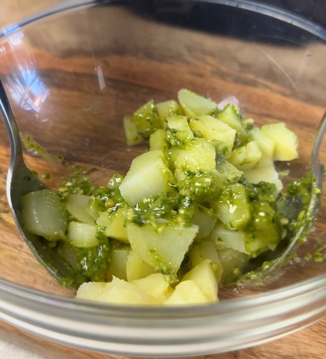 In una ciotola uniamo le patate lesse tagliate a cubetti e condiamole con un po’ di pesto.