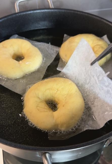 Friggiamo le ciambelle in abbondante olio caldo immergendole direttamente con la carta forno alla base, in questo modo manterranno la forma. Dopo qualche istante si staccherà facilmente e basterà sfilarla con una pinza.