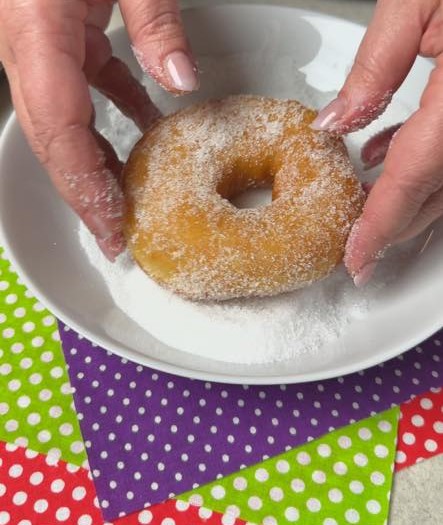 Rotoliamo le ciambelle fritte di patate nello zucchero quando sono ancora molto calde in modo da rivestirle completamente.