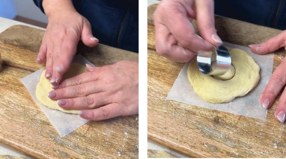 3) Potete anche semplicemente formare una pallina appiattirla sul quadratino di carta forno e con lo stampo piccolo a cerchio formare un buco al centro.