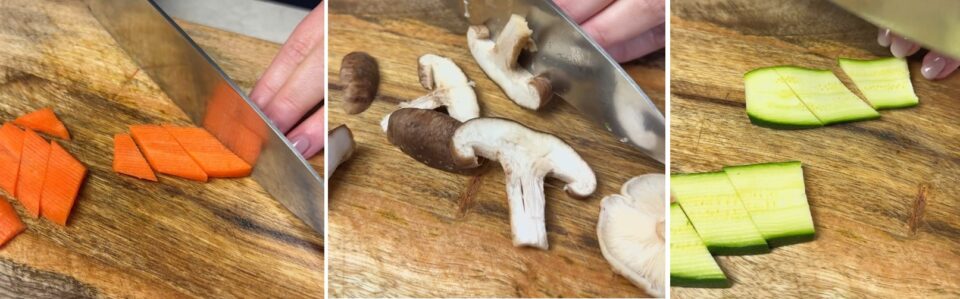 Tagliamo zucchina e carota a fette abbastanza sottili e poi a segmenti in diagonale.