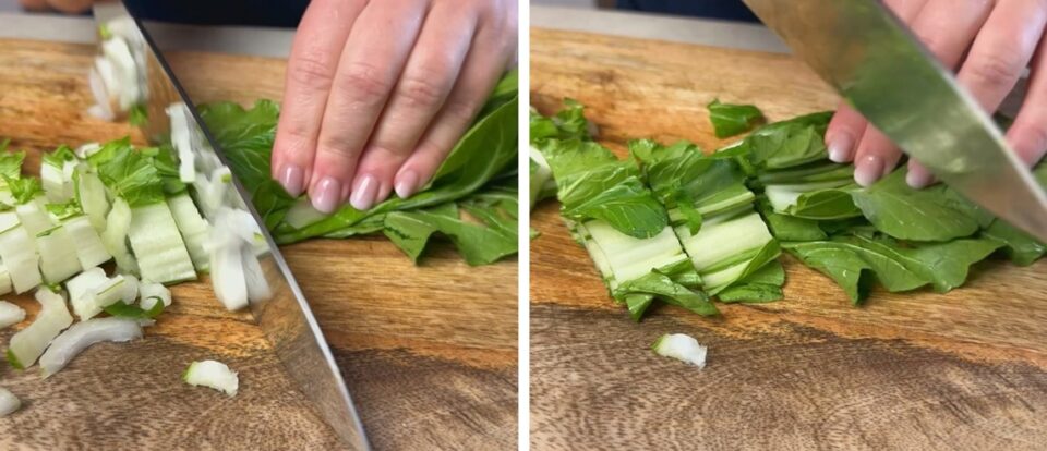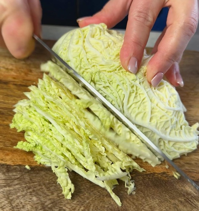 Infine, tagliamo la verza a striscioline molto sottili e sminuzziamo il cipollotto.