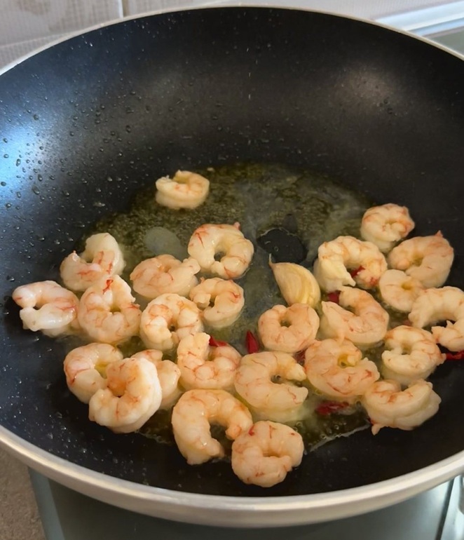 Appena sarà ben calda, uniamo i gamberi e cuociamoli per un minuto.