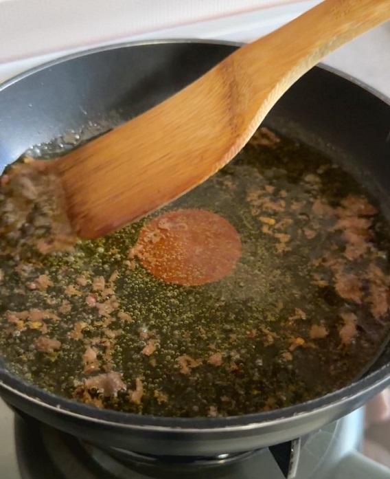 Aggiungiamo i filetti di alici e facciamoli sciogliere e disfare completamente, sgranandoli. Facciamo questa operazione a fiamma bassa.