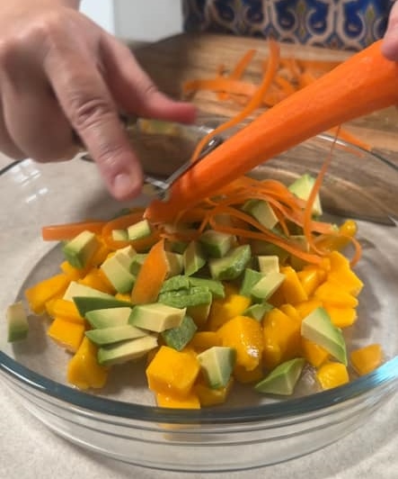 Per l’insalata uniamo: mango e avocado sbucciati e tagliati a piccoli pezzetti, una carota (io la taglio a striscioline sottili con il pelapatate) ed i pomodorini.