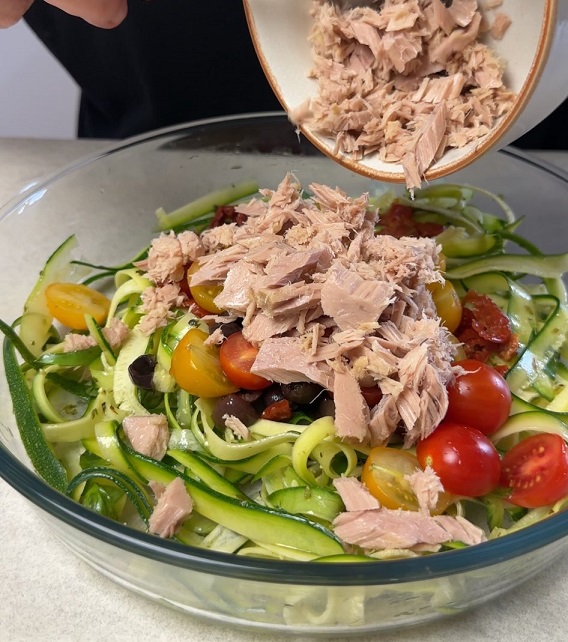 Quando le giornate si fanno calde, c’è bisogno di piatti leggeri, freschi e veloci da preparare proprio come questa insalata con zucchine marinate. Un’esplosione di gusto e semplicità, dove la croccantezza delle zucchine incontra la sapidità del tonno, la dolcezza dei pomodorini e il tocco intenso dei pomodori secchi. Il bello? Le zucchine resteranno croccanti proprio perché non vengono cotte. Manterranno intatte tutte le loro proprietà nutrizionali, rendendo questo piatto non solo goloso ma anche sano e bilanciato. Perfetta da preparare in anticipo, da portare al mare o al lavoro.