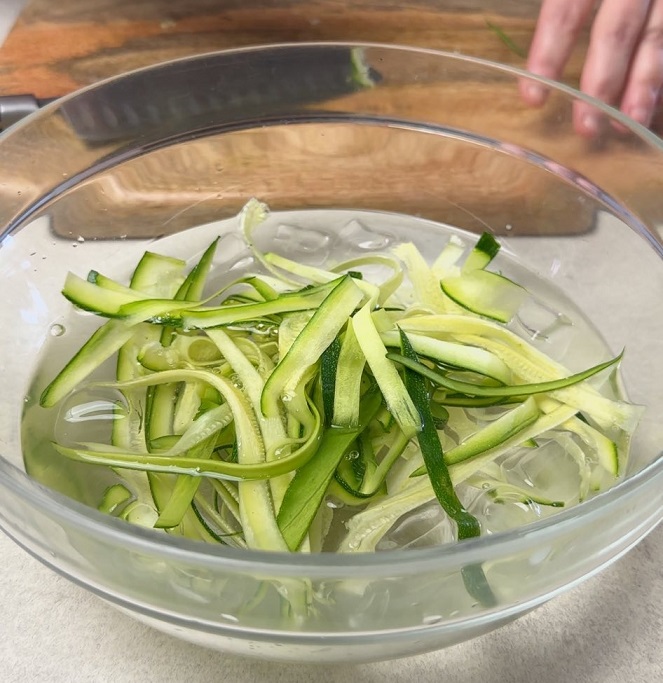 Mettiamole a bagno in acqua e ghiaccio (servirà per renderle croccanti ed a mantenere inalterato il colore verde brillante) e lasciamole in ammollo per circa 15 minuti.