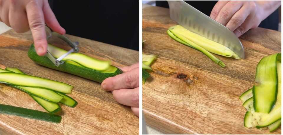 Laviamo le zucchine e tagliamole a fettine sottilissime per il senso della lunghezza, con l’aiuto di un pela patate o di una mandolina.