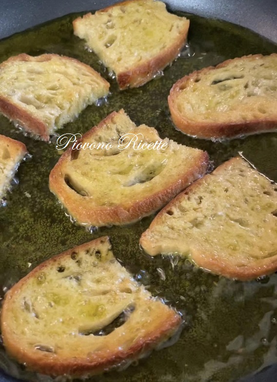 Scaldiamo l’olio e, non appena ben caldo, rosoliamo le fette di pane, un po alla volta.