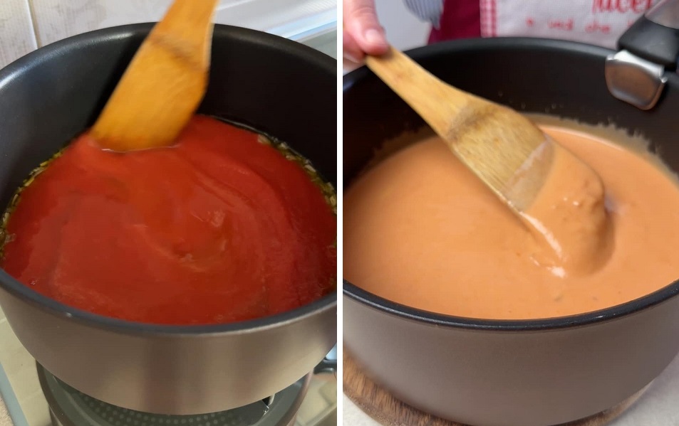 Nel frattempo, uniamo la besciamella alla passata di pomodoro.