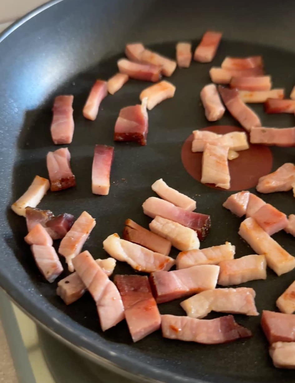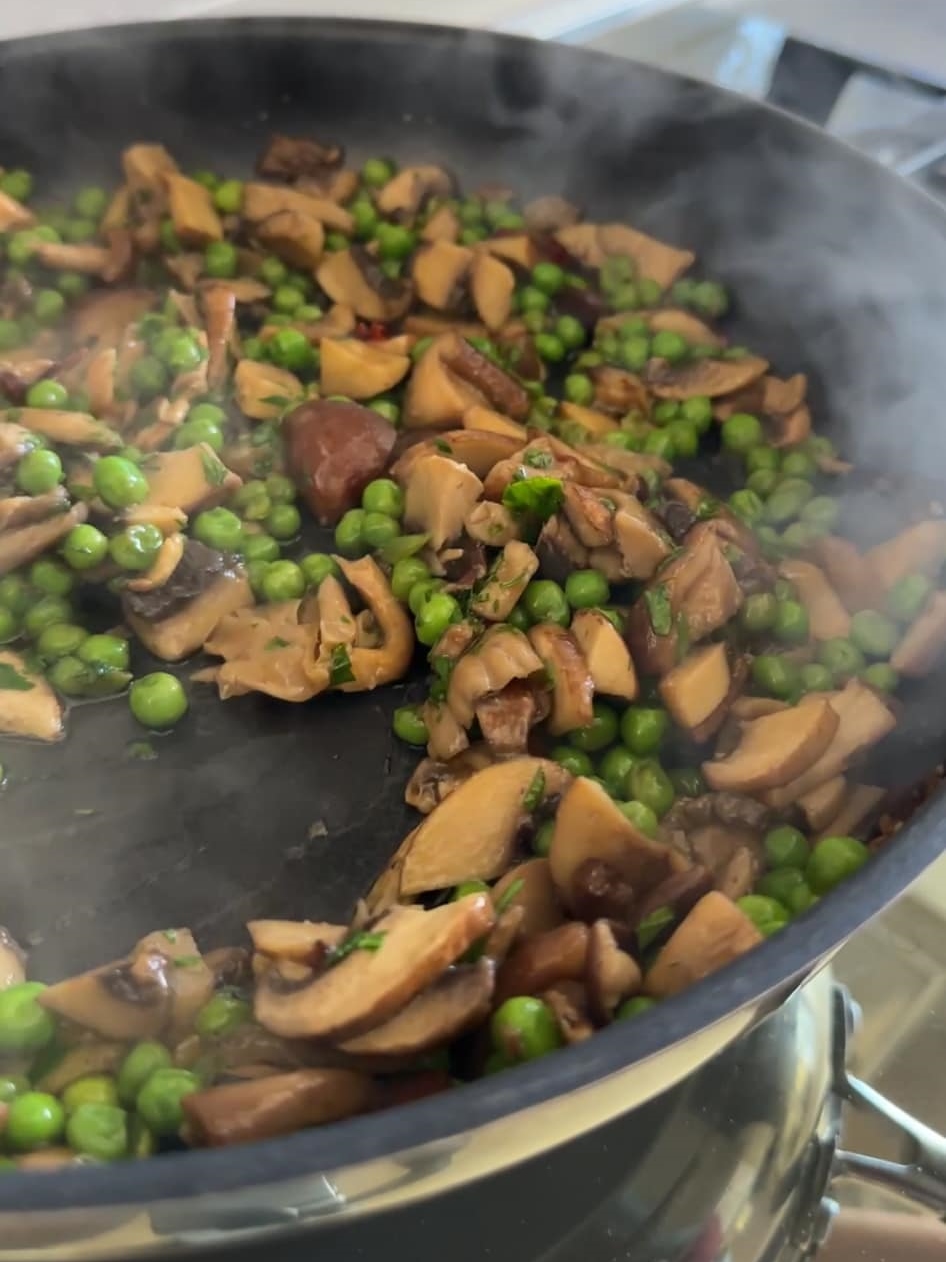 Uniamo anche lo speck, funghi, piselli ed abbondante parmigiano grattugiato.