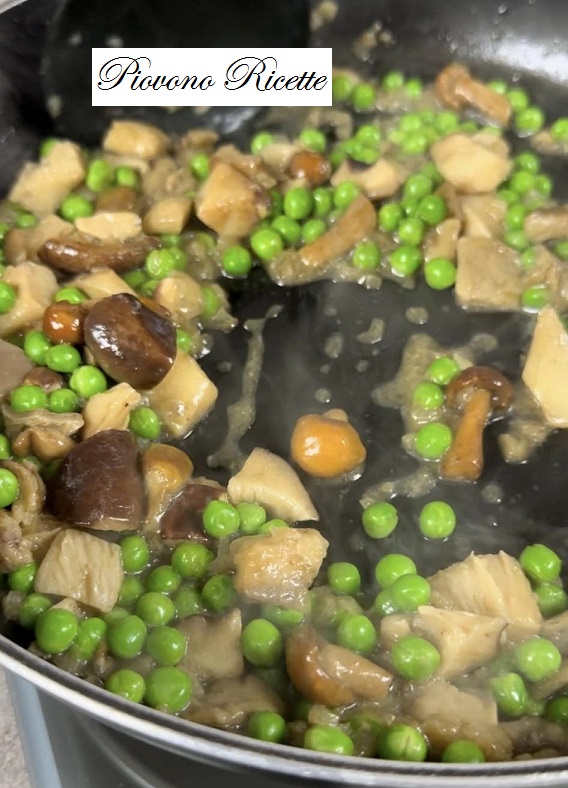 Aggiungiamo anche i piselli ed insaporiamo il tutto con un pizzico di sale.