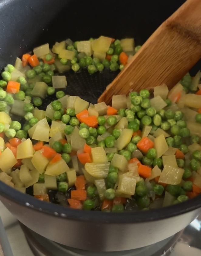Lasciamo cuocere 5-6 minuti ed uniamo i piselli. Regoliamo di sale.