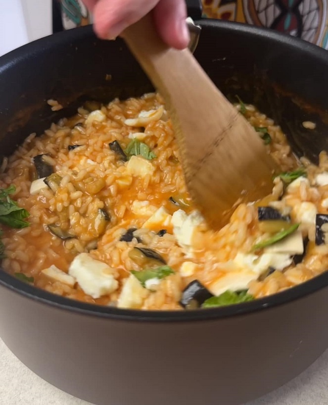 Il risotto con melanzane e provola affumicata è pronto per essere servito. Mi raccomando va mangiato con la forchetta in modo che passi sempre aria tra i chicchi.