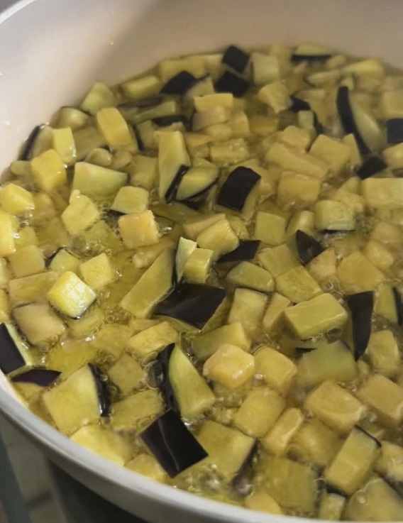 Non appena sarà ben caldo, uniamo le melanzane e friggiamole girandole da tutti i lati in modo che si dorino in modo uniforme.