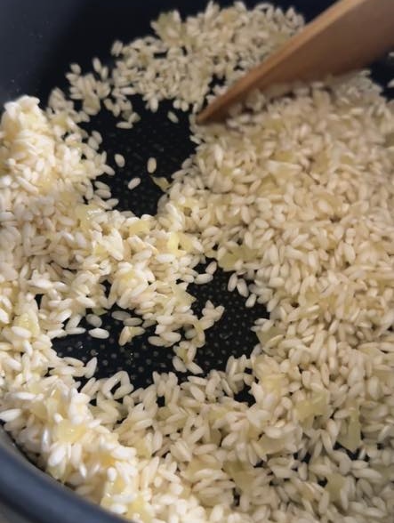 Quando sarà appassita alziamo la fiamma ed uniamo il riso ed un pizzico di sale.