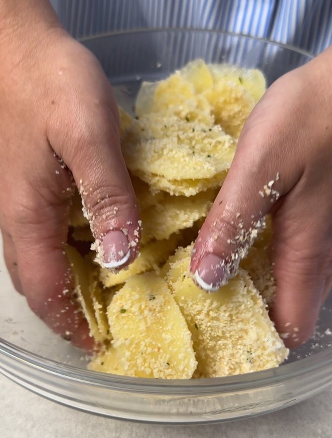 Oggi vi presento una ricetta che vi piacerà tantissimo: la schiacciata di patate. È croccante fuori, filante dentro e super saporita grazie al goloso cuore di mozzarella e mortadella. Si prepara con pochi ingredienti e in modo molto semplice: patate tagliate sottilissime, parmigiano, pangrattato che aiuteranno a creare una crosticina croccante sotto e sopra e uno strato godurioso e filante al centro.