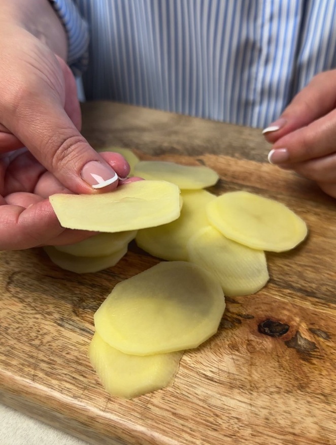 Dopo averle pelate tagliamo le patate a fette molto sottili.