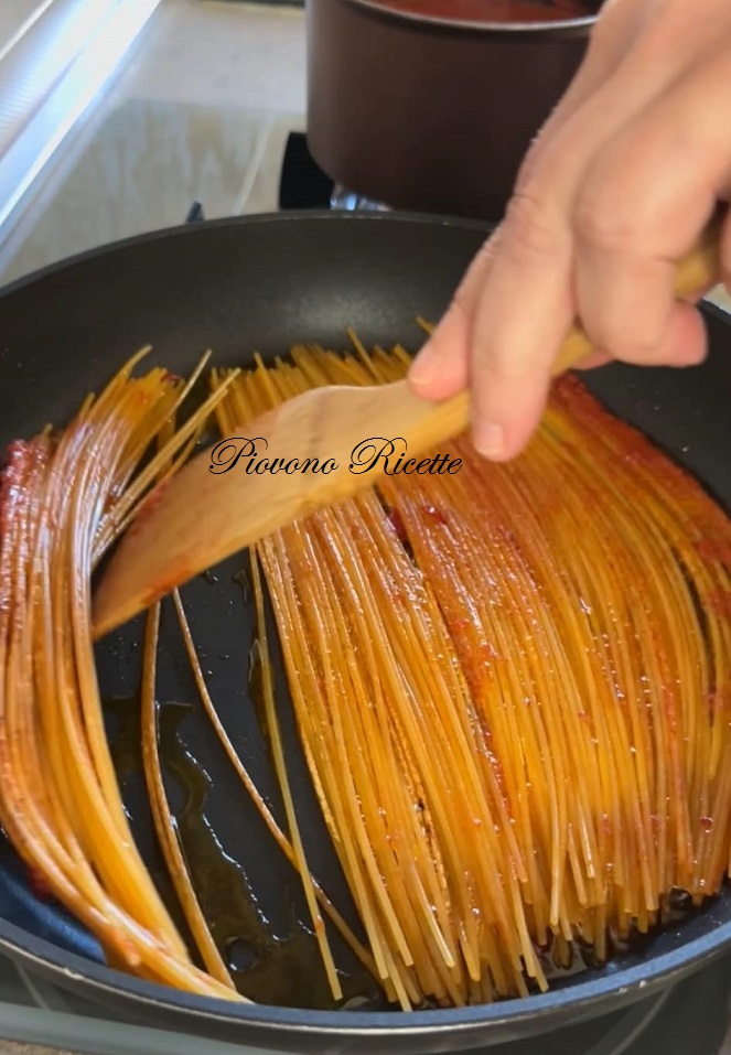 Possiamo aggiungere il brodo di pomodoro un po’ alla volta, man mano che viene assorbito dagli spaghetti.