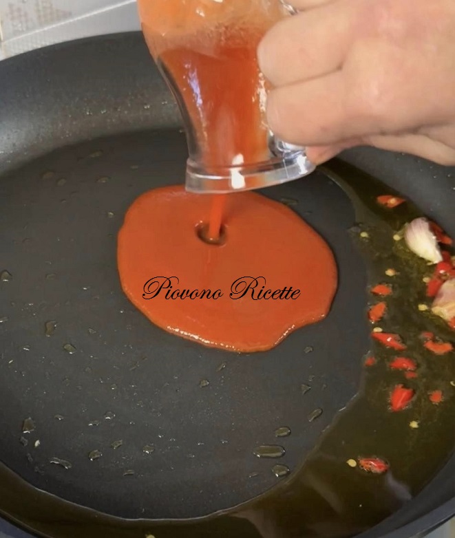 Uniamo la passata di pomodoro e lasciamo cuocere qualche minuto (eliminiamo l’aglio).