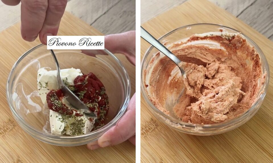 In una ciotola uniamo: il concentrato di pomodoro, il formaggio fresco spalmabile ed una manciata di origano.