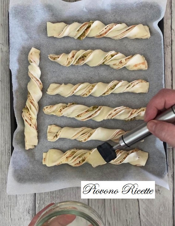 Trasferiamo i torciglioni di pasta sfoglia su una teglia rivestita di carta da forno.