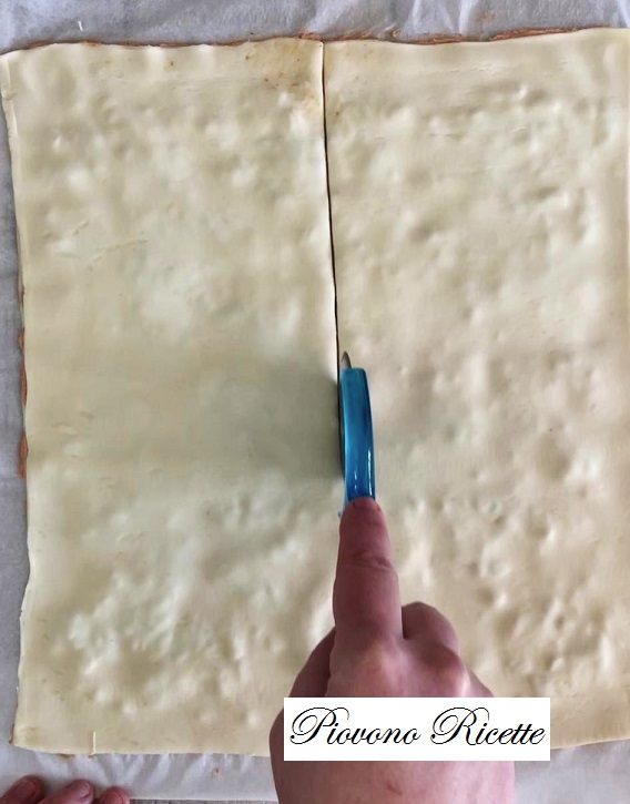 Trasferiamo due strisce di sfoglia sul piano di lavoro e sovrapponiamole.