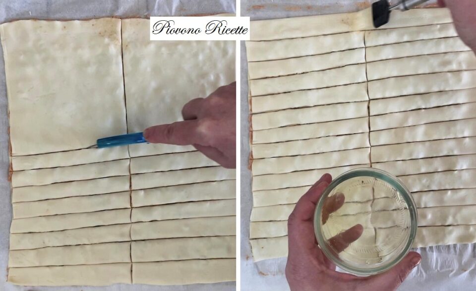 Sempre con la rotella tagliamo le due metà a strisce larghe circa 2 centimetri per il senso della larghezza.