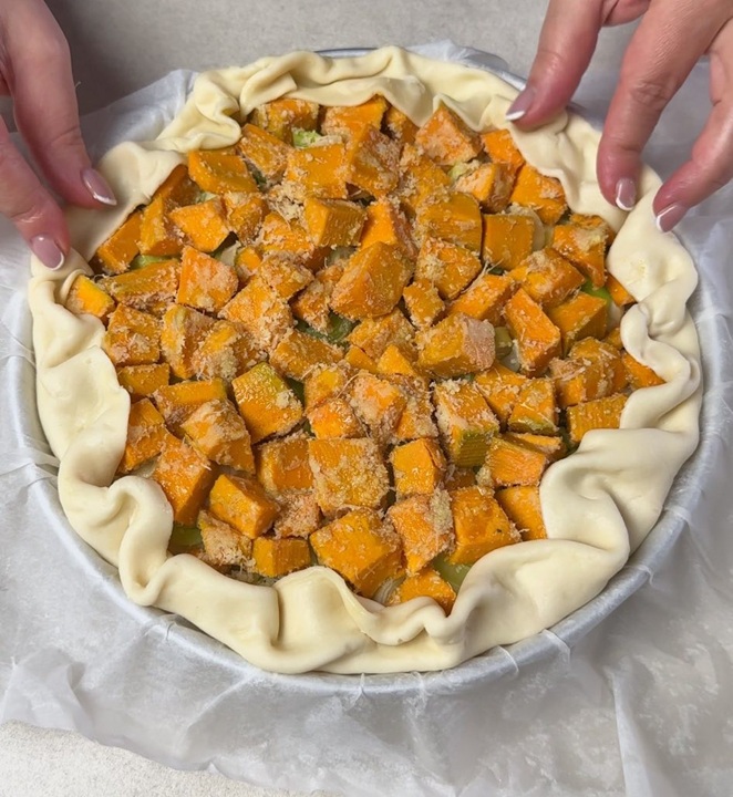 Inseriamola nella tortiera livellandola e richiudiamo i bordi della pasta brisè formando il cornicione.