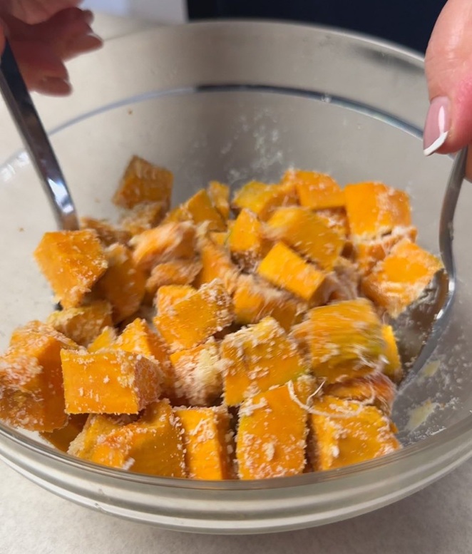 Nella stessa ciotola raccogliamo la zucca a cubetti e condiamola olio, sale e parmigiano.